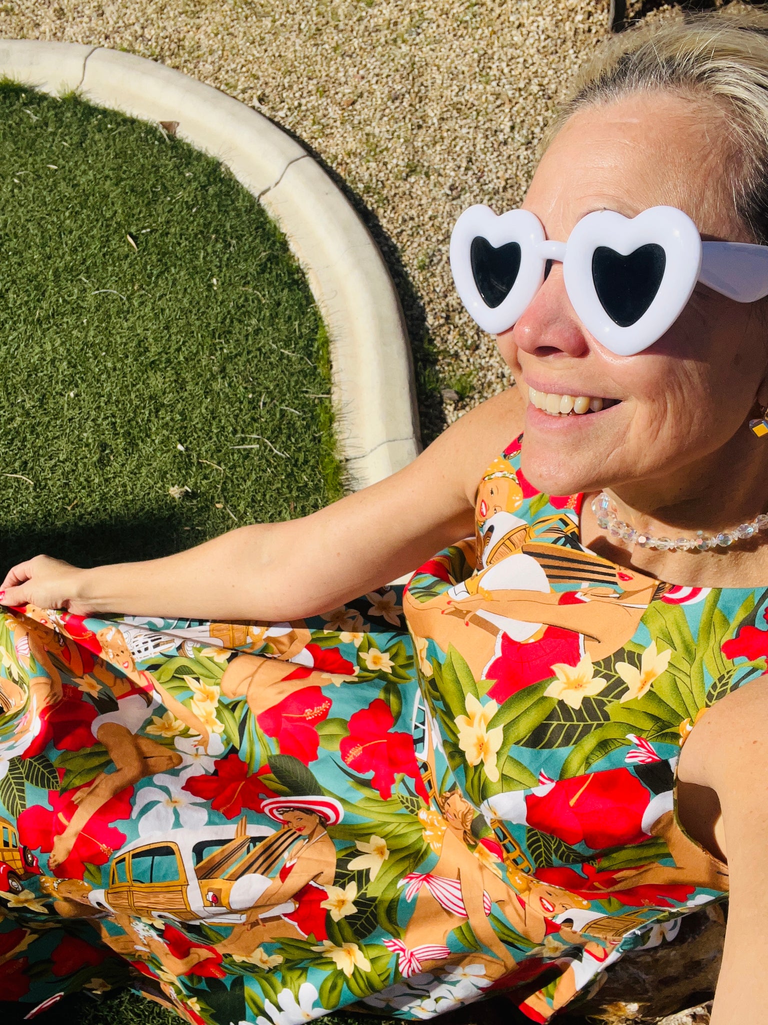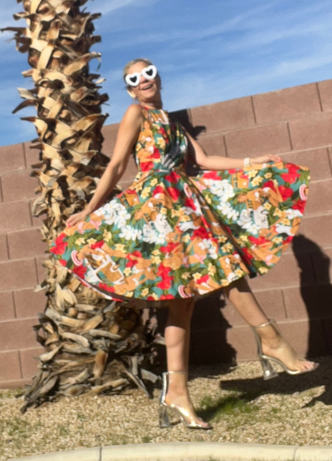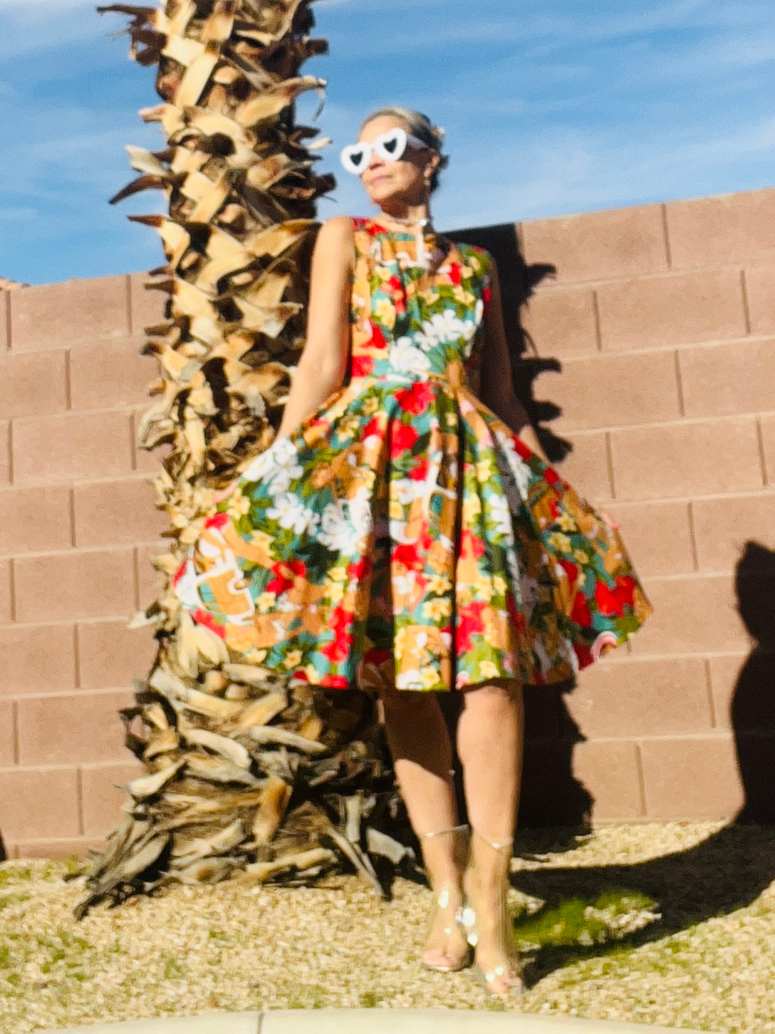A fun and flirty 50’s inspired baby doll statement dress with a whimsical pattern of bathing beauties, Volkswagen's and exotic flowers. Rich colors of red, white, tan, brown, and teal blue. Round neck, sleeveless, zips up in back, very comfortable. Dimensions: Size M, (6-10), 100% Polyester, Dry Clean recommended, 24”Bust, 28”-32” Waist, 38”Length. A cool statement piece for Spring and Summer, even a Holiday look, a MUST HAVE!