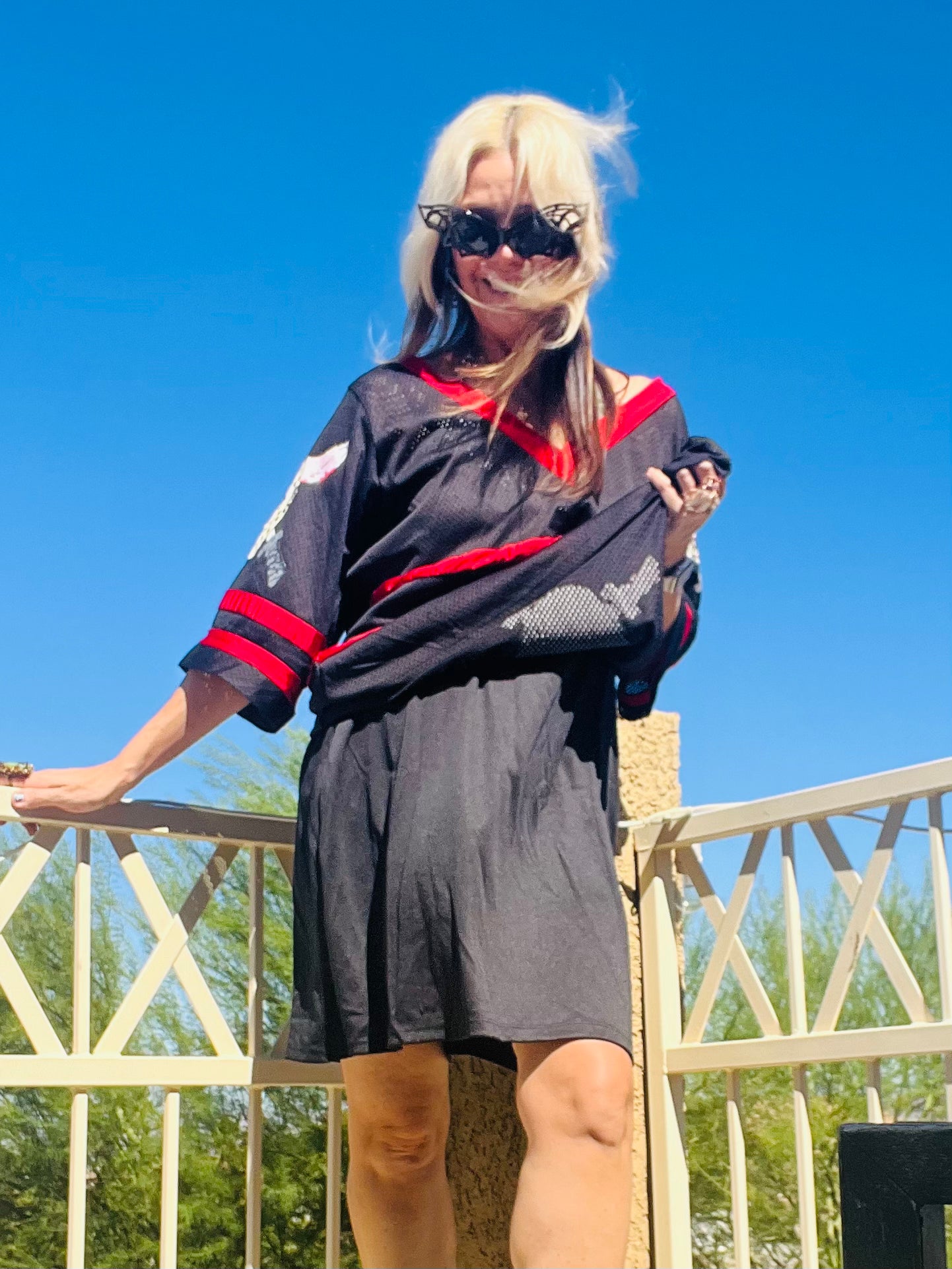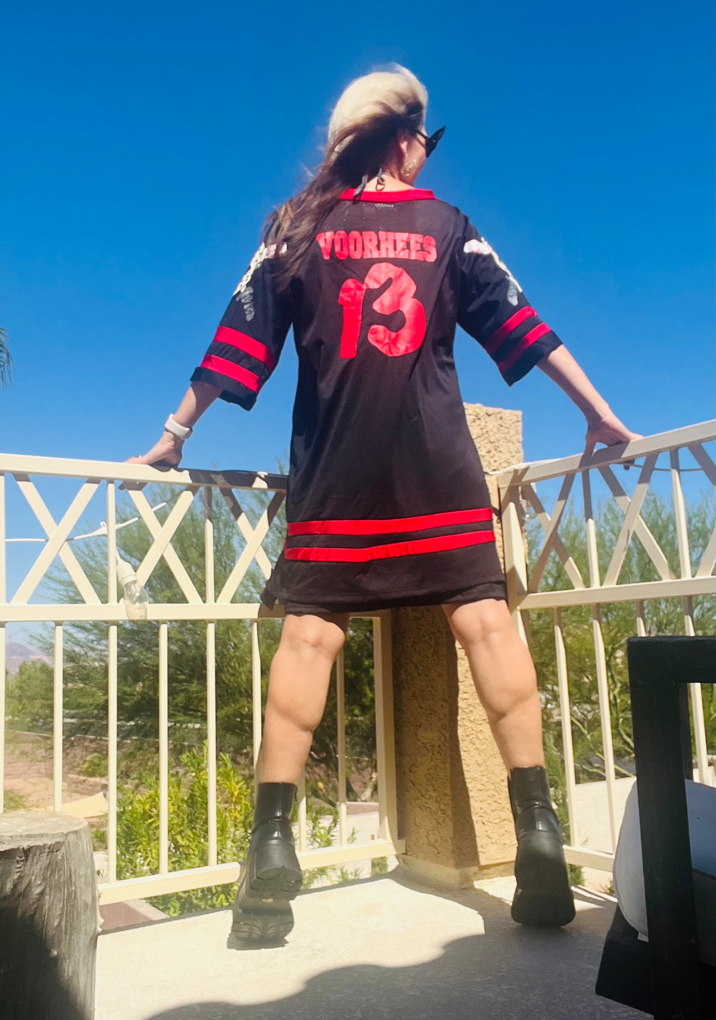 Friday The 13th (brand), women’s dress, custom lined, a perfect collectible piece for your Halloween collection. Use it as a costume, or everyday wear, perfect either way. Dimensions: X-Large, (4-10), Jersey cut, Polyester/ Nylon blend, v- neck,35”Length, 32”-40” Bust, 28”-36” Waist, 15” Sleeve, machine wash cold. This is sich a cool look with “Voohres 13” on back, and a Jason ski mask design throughout. Wear it as a dress or a jersey tee, fits fantastic either way. Better scoop it up, it won’t last!