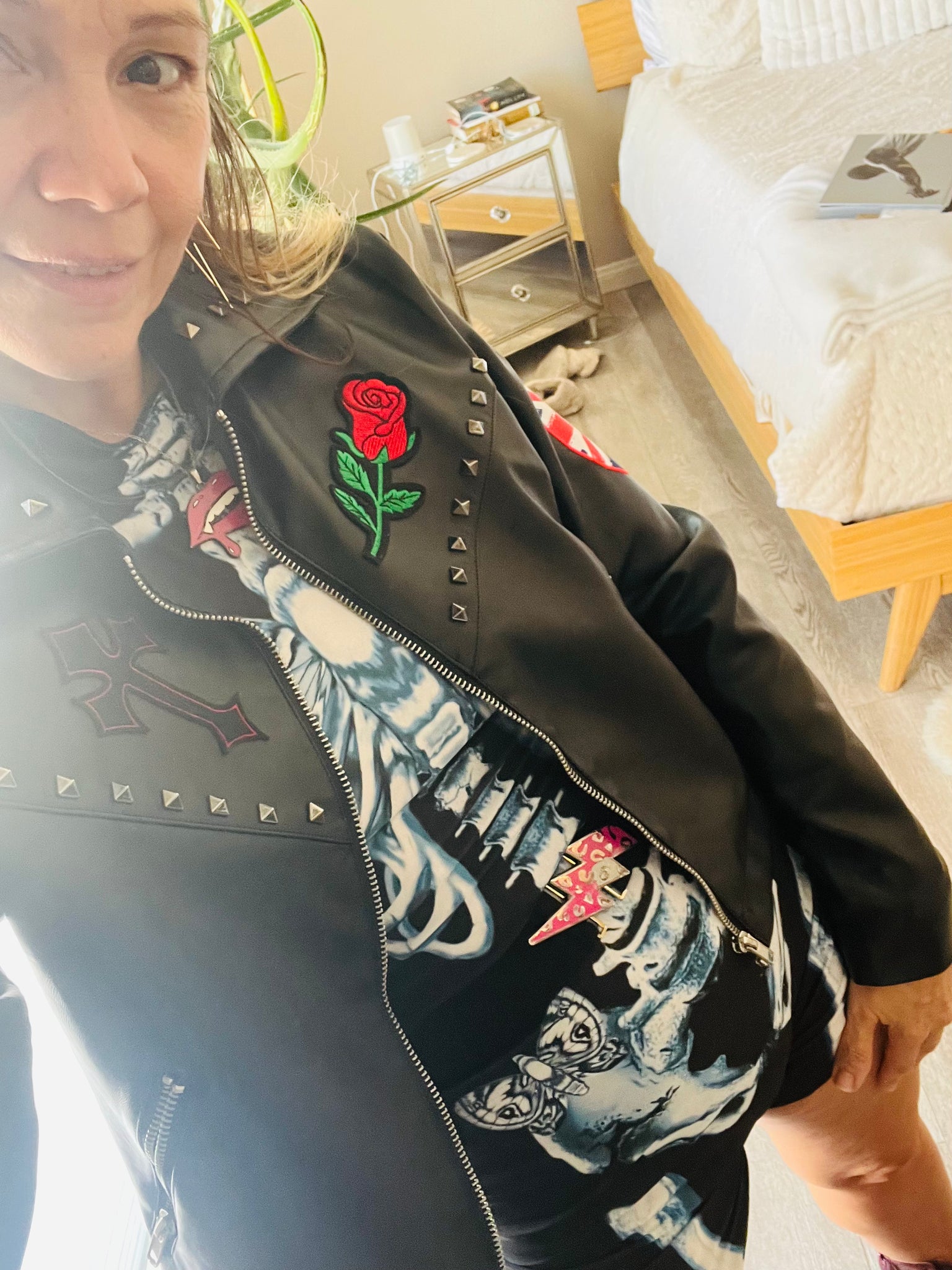 Black pleather Spirit Halloween , rocker jacket with “Girl Gang” patchwork on back against black and red plaid fabric. Cool retro nod to the punk 80’s and 90’s vibe, with flower and cross accents, spike decals on collar and trim work throughout . So many cool features patchwork skull on sleeve, moon and butterfly patchwork as well. Diagonal zipper pockets with lined polyester for extra comfort, perfect for fall. Dimensions: Size M (women), zipper front, 100% polyurethane, wipe clean only, or dry clean. 34”-36” Bust, 27”-30” Waist, 20”Length, 22” Sleeve, 4” Collar. Such a fun statement piece for Halloween or just for everyday wear.