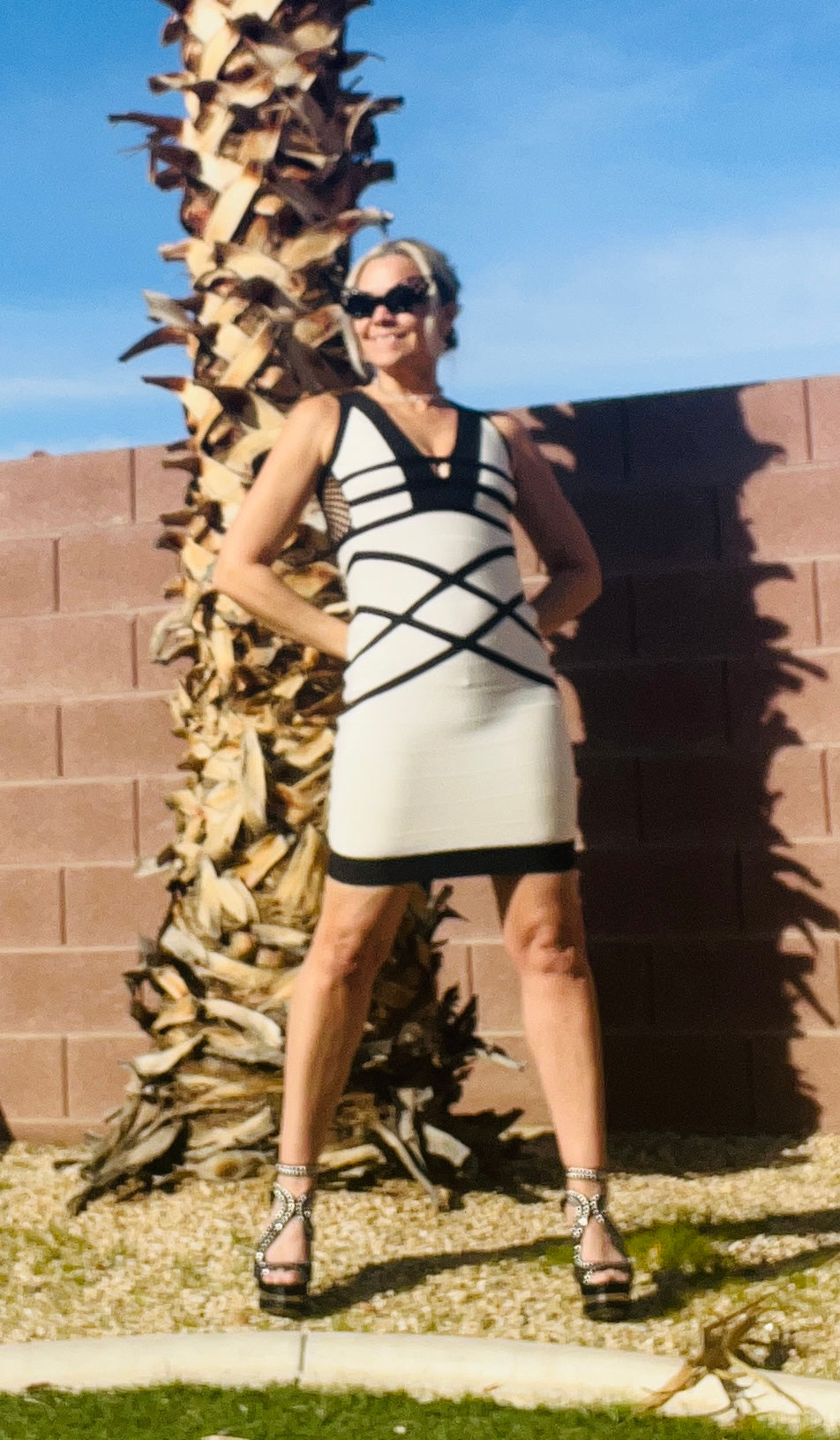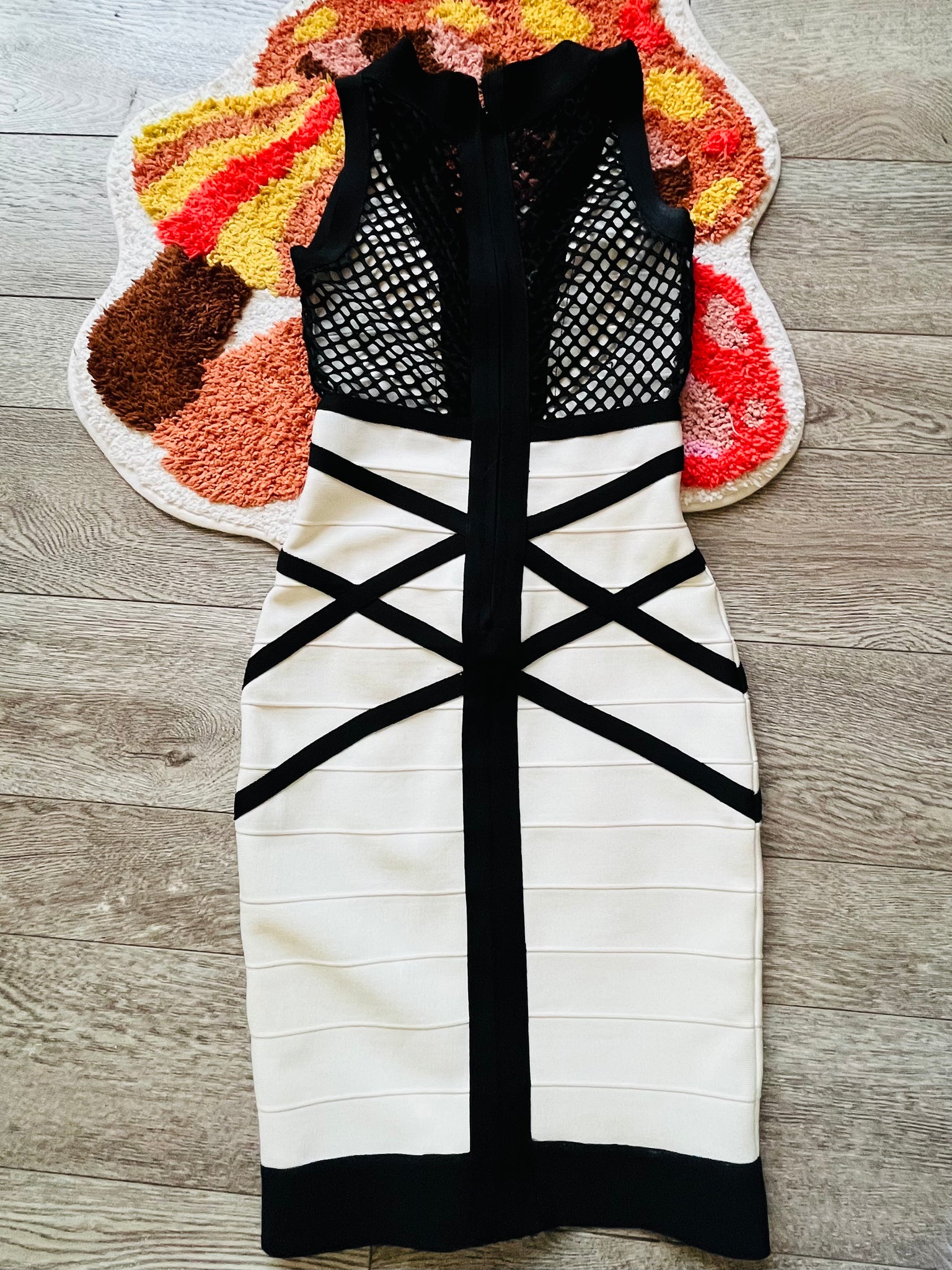 A stunning custom made Instantly Slimming Statement Dress white with black stripe criss cross design, paneled all the way down. Beautiful black net style framework that run along the back. Dimensions: Size XS/Petite, (00), Polyester/ Lycra/ Nylon blend, 30”-34”A/B cup, 24”-25” Waist, 33”-34” Hip, 33.5” Length, Dry Clean Only. So comfortable, ultra stretch, gives a beautiful hour glass look, EXCELLENT QUALITY and comfort.