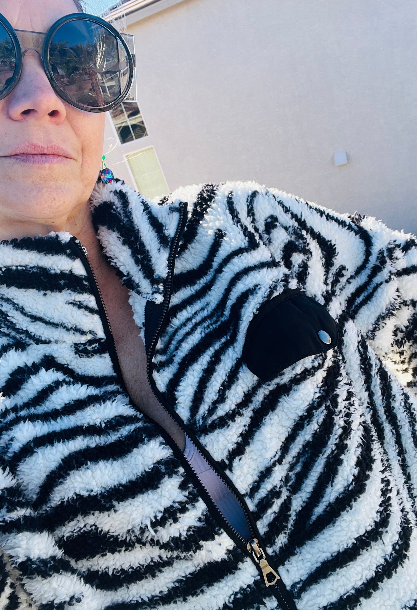 Vintage inspired mock neck faux fur coat with Zebra pattern. Zipper front ,3D front pocket with snap, deep diagonal pockets, and a fluffy sherpa style. Black trim work, great black and white contrast, soft, comfortable, with elastic stretch around wrists for extra comfort. Dimensions: Size S, 100% Polyester, machine wash cold, 33”-36” Chest, 26”-32” Waist, 23” Length, 20” Sleeve. Great for winter and Spring, very Chic, won’t last long!
